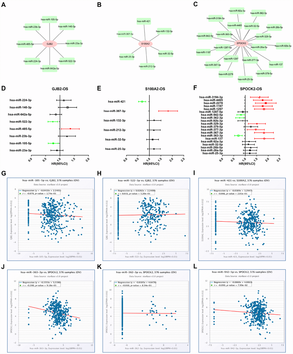 Growing evidences have suggested that miRNAs mainly participate in negatively regulating gene expression and thereby play important roles in a variety of human biological processes, including cancer initiation and development [4, 26, 27]. Thus, we first predicted upstream miRNAs of GJB2, S100A2 and SPOCK2 through seven predicting programs as mentioned above (Table 2). Finally, 8, 6 and 20 upstream miRNAs were found to potentially target GJB2, S100A2 and SPOCK2, respectively. For better visualization, miRNA-GJB2, miRNA-S100A2 and miRNA-SPOCK2 sub-networks were established as shown in Figure 5A–5C. Then, we evaluated the prognostic values of these miRNAs in ovarian cancer using TCGA data. As shown in Figure 5D, among all the predicted miRNAs of GJB2, high expression of hsa-miR-522-3p and hsa-miR-105-5p indicated favorable OS of patients with ovarian cancer but hsa-miR-485-5p was an unfavorable prognostic biomarker for ovarian cancer. For S100A2, upregulation of hsa-miR-421 and hsa-miR-367-3p correlated with good and bad prognosis, respectively (Figure 5E). As presented in Figure 5F, regarding to these miRNAs of SPOCK2, high expression of hsa-miR-363-3p, hsa-miR-362-3p and hsa-miR-942-5p showed favorable OS but increased expression of hsa-miR-137, hsa-miR-367-3p, hsa-miR-377-3p, hsa-miR-329-3p, hsa-miR-1297, hsa-miR-1197, hsa-miR-2278, hsa-miR-4465 and hsa-miR-3194-3p linked to unfavorable OS. In view of miRNA functional mechanism and oncogenic roles of GJB2, S100A2 and SPOCK2, upstream miRNAs of the three genes should be tumor suppressive miRNAs. Therefore, six miRNA-mRNA pairs, including hsa-miR-105-5p-GJB2, hsa-miR-522-3p-GJB2, hsa-miR-421-S100A2, hsa-miR-363-3p-SPOCK2, hsa-miR-362-3p-SPOCK2 and hsa-miR-942-5p-SPOCK2, were selected for subsequent expression correlation analysis. Figure 5G–5L told us that only hsa-miR-363-3p was significantly negatively correlated with SPOCK2 in ovarian cancer. Altogether, hsa-miR-363-3p-SPOCK2 axis may be the most potential pathway in mediating tumor stage progression of ovarian cancer.