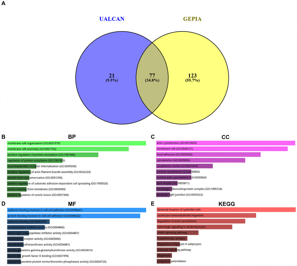 Co-expression analysis was performed using two databases, namely UALCAN and GEPIA. 100 and 200 co-expressed genes were obtained from UALCAN and GEPIA as listed in Supplementary Table 3. By intersection of two gene sets, we found that 77 co-expressed genes of SPOCK2 were commonly appeared in the two databases (Figure 6A and Supplementary Table 4). The 77 genes and their correlation coefficients were presented in Table 3. GO functional annotation and KEGG pathway enrichment analysis were introduced to better understand these genes via Enrichr database. The top 10 enriched GO terms were shown in Figure 6B–6D, containing membrane raft organization, membrane raft assembly and positive regulation of protein acetylation in the BP category, actin cytoskeleton, membrane raft and focal adhesion in the CC category, and cadherin binding involved in cell-cell adhesion, protein binding involved in cell-cell adhesion and cadherin binding in the MF category. The top 10 enriched KEGG pathways were presented in Figure 6E, including bacterial invasion of epithelial cells, leukocyte transendothelial migration and regulation of actin cytoskeleton. These findings demonstrate that hsa-miR-363-3p-SPOCK2 axis may regulate actin cytoskeleton and thereby take part in cell adhesion, invasion and migration, and finally suppress progression of ovarian cancer.