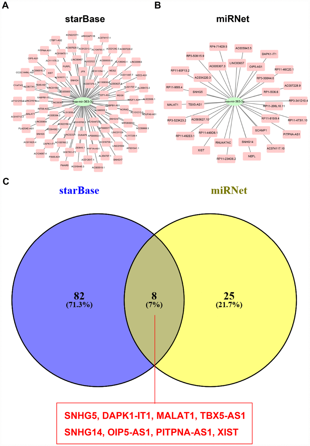miRNet (https://www.mirnet.ca/), an easy-to-use comprehensive platform integrated data from several miRNA-linked databases (TarBase, miRTarBase, miRecords, miRanda), was employed to predict the potential lncRNAs binding to hsa-miR-363-3p. Subsequently, these lncRNAs were intersected with the lncRNAs obtained from starBase database to acquire the most potential regulatory lncRNAs of hsa-miR-363-3p.