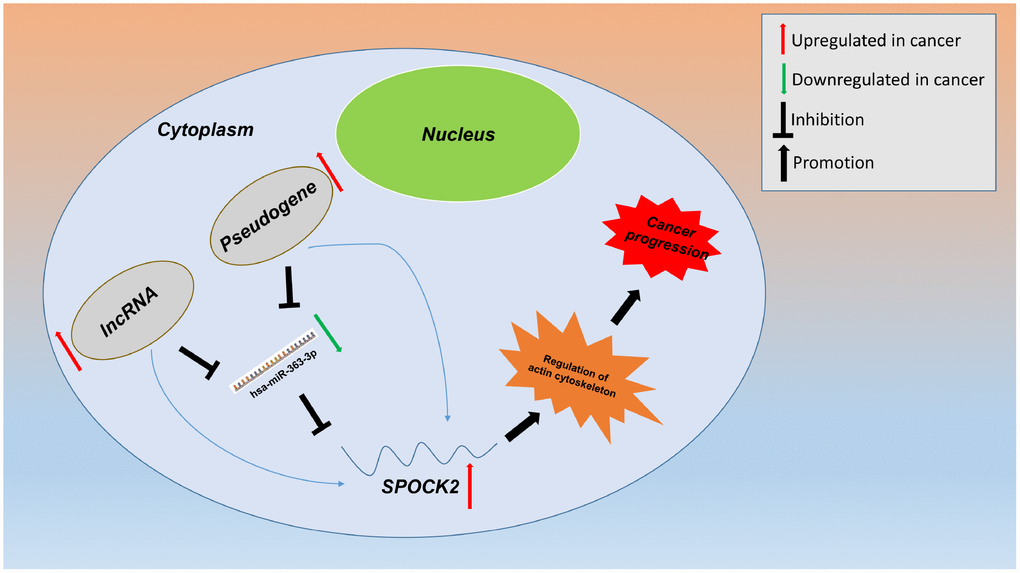 In summary, a series of integrated bioinformatics analyses suggest that hsa-miR-363-3p-SPOCK2 axis may play key roles in progression of ovarian cancer by regulating actin cytoskeleton. Furthermore, the potential upstream pseudogenes and lncRNAs of has-miR-363-3p-SPOCK2 axis are successfully identified. The constitutes in this pseudogenes/lncRNAs-hsa-miR-363-3p-SPOCK2 network may be utilized as promising therapeutic targets and prognostic biomarkers in the future.