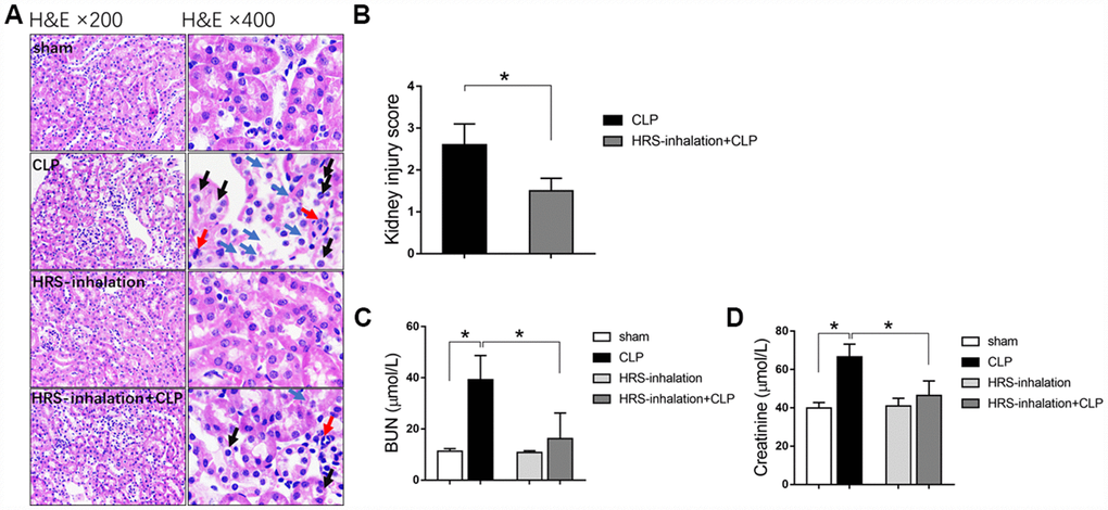 We generated a mouse model of septic AKI through a cecal ligation and puncture (CLP) operation. To study the effects of the HRS on septic AKI, we established four groups of mice: a sham operation group, a CLP group, a HRS inhalation group, and a HRS inhalation + CLP group. In our mouse model, AKI occurred in the early stage of sepsis. To evaluate the degree of kidney injury, we performed hematoxylin and eosin staining on renal pathological sections. The septic kidneys exhibited obvious pathological changes, including bleb formation, tubular necrosis, inflammatory cell infiltration, cell swelling, cytoplasm rarefaction, loss of the brush border, tubular luminal debris and obstruction (Figure 1A and 1B). The blood urea nitrogen (BUN) (Figure 1C) and serum creatinine (Figure 1D) concentrations were significantly elevated in the mice with septic AKI, reflecting their impaired renal function. Aerosol inhalation of the HRS for one hour prevented the changes in renal pathology, BUN and serum creatinine in mice that underwent the CLP (P<0.05), but did not alter these pathological and biochemical parameters in mice subjected to a sham operation. These results indicated that aerosol inhalation of a HRS protected the kidneys during the early stage of septic AKI.