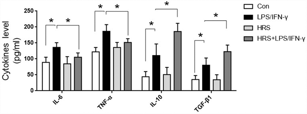 To investigate the effects of the hydrogen-rich medium on macrophage-associated cytokines, we used an enzyme-linked immunosorbent assay (ELISA) to detect cytokine levels in the culture supernatants of RAW 264.7 cells after induction. The levels of IL-6, TNF-α, IL-10 and TGF-β1 in the supernatant were significantly greater in the LPS/IFN-γ group than in the control group (P<0.05) (Figure 10). M1 macrophage-associated pro-inflammatory cytokine (IL-6 and TNF-α) levels were lower in the hydrogen-rich-medium-treated LPS/IFN-γ group than in the LPS/IFN-γ group, while M2 macrophage-associated anti-inflammatory cytokine (IL-10 and TGF-β1) levels were higher in the hydrogen-treated group (P<0.05). These results suggested that the hydrogen-rich medium altered cytokine levels and promoted the polarization of macrophages to the M2 type.
