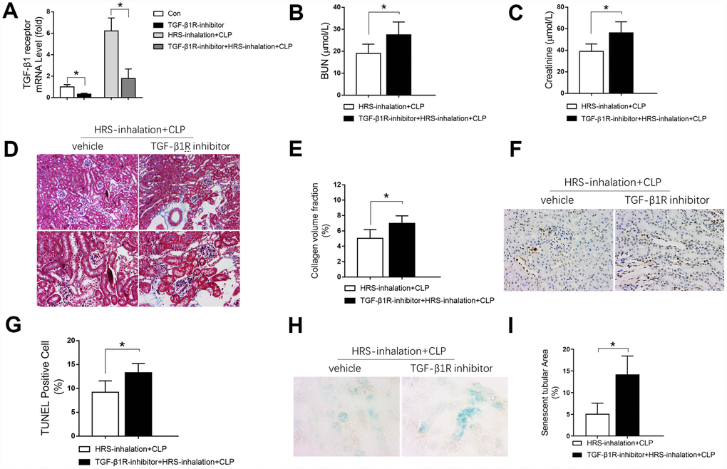 We then investigated whether cytokine receptors contributed to the effects of HRS inhalation in septic AKI. As shown in Figure 11A, HRS inhalation increased renal Tgf-β1 receptor expression during CLP. Accordingly, pretreatment with the TGF-β1 receptor inhibitor SB-431542 effectively prevented the increase in Tgf-β1 receptor expression upon HRS inhalation in CLP mice (Figure 11A). Moreover, inhibiting the TGF-β1 receptor increased the BUN levels (Figure 11B), serum creatinine levels (Figure 11C), renal tissue collagen volume fraction (Figure 11D and 11E), percentage of TUNEL-positive renal tubular epithelial cells (Figure 11F and 11G) and senescent tubular area (Figure 11H and 11I) in the HRS + CLP mice. Thus, inhibiting the TGF-β1 receptor partly reversed the effects of the HRS on renal function, fibrosis, tubular epithelial cell apoptosis and senescence in septic mice. These results indicated that HRS inhalation exerted renal protective effects mainly by enhancing anti-inflammatory cytokine expression.