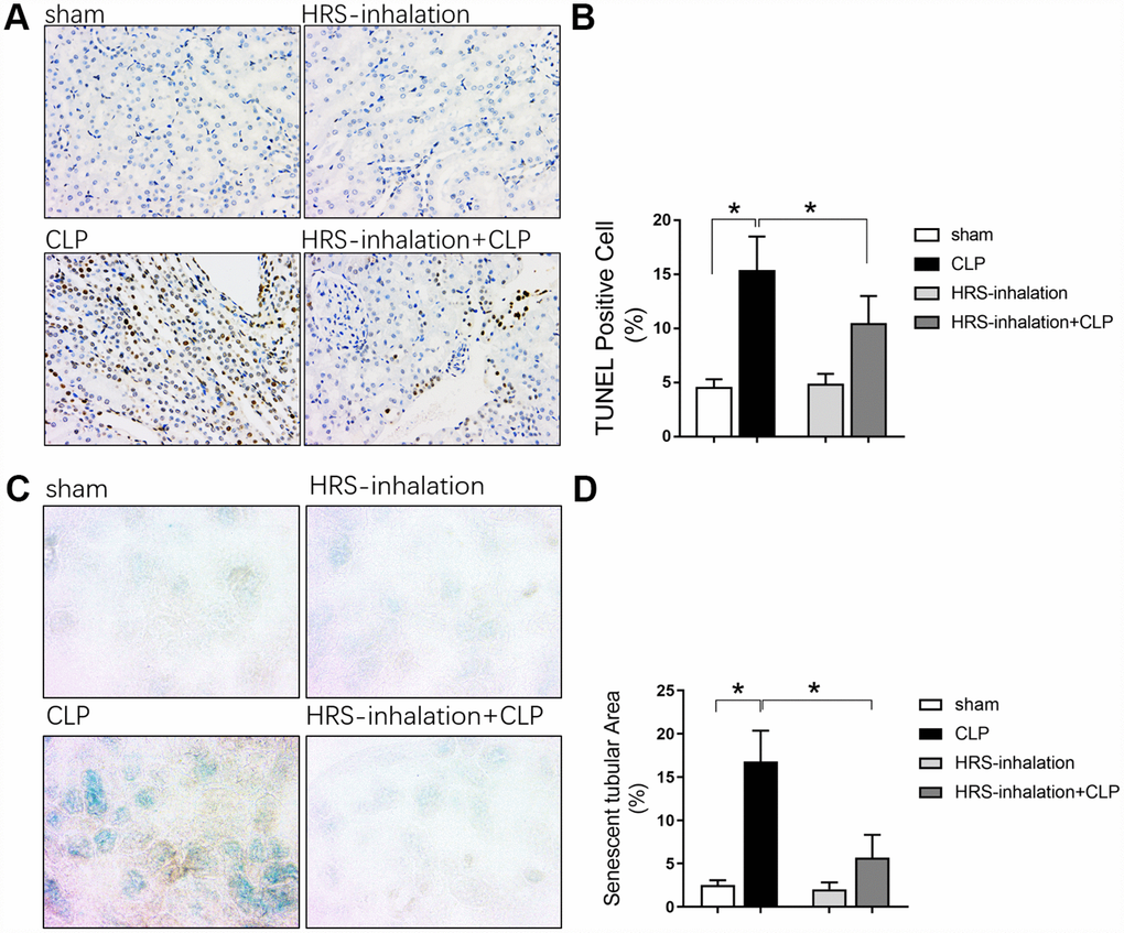 Renal tubular epithelial cells are important for renal function. To explore the underlying mechanism of septic AKI, we performed terminal deoxynucleotidyl transferase dUTP nick end labeling (TUNEL) and β-galactosidase staining to detect renal tubular epithelial cell apoptosis and senescence, respectively, in the four groups of mice. Apoptosis and senescence increased rapidly in the early stage after sepsis attack, as evidenced by the significantly greater percentage of TUNEL-positive renal tubular epithelial cells (Figure 2A and 2B) and senescent tubular area (Figure 2C and 2D) in the CLP group than in the sham group (P<0.05). Aerosol inhalation of the HRS dramatically reduced the percentage of TUNEL-positive renal tubular epithelial cells (Figure 2A and 2B) and the senescent tubular area (Figure 2C and 2D) (P<0.05 vs. CLP group). These results indicated that aerosol inhalation of the HRS may have protected the kidneys by attenuating renal tubular epithelial cell injury.