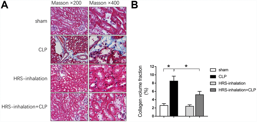 We next performed Masson’s Trichrome staining to assess fibrosis formation in the kidneys of the four groups of mice. Kidney fibrosis increased significantly during early sepsis, as evidenced by the greater blue staining of extracellular matrix deposits in the CLP group than in the sham group (P<0.05) (Figure 3A and 3B). Aerosol inhalation of the HRS reduced the blue staining in the kidney cortex in mice subjected to CLP (P<0.05 vs. CLP group) (Figure 3A and 3B), but did not alter the blue staining in the sham operation group. These results suggested that aerosol inhalation of the HRS may have protected the kidneys by retarding the progression of renal fibrosis.