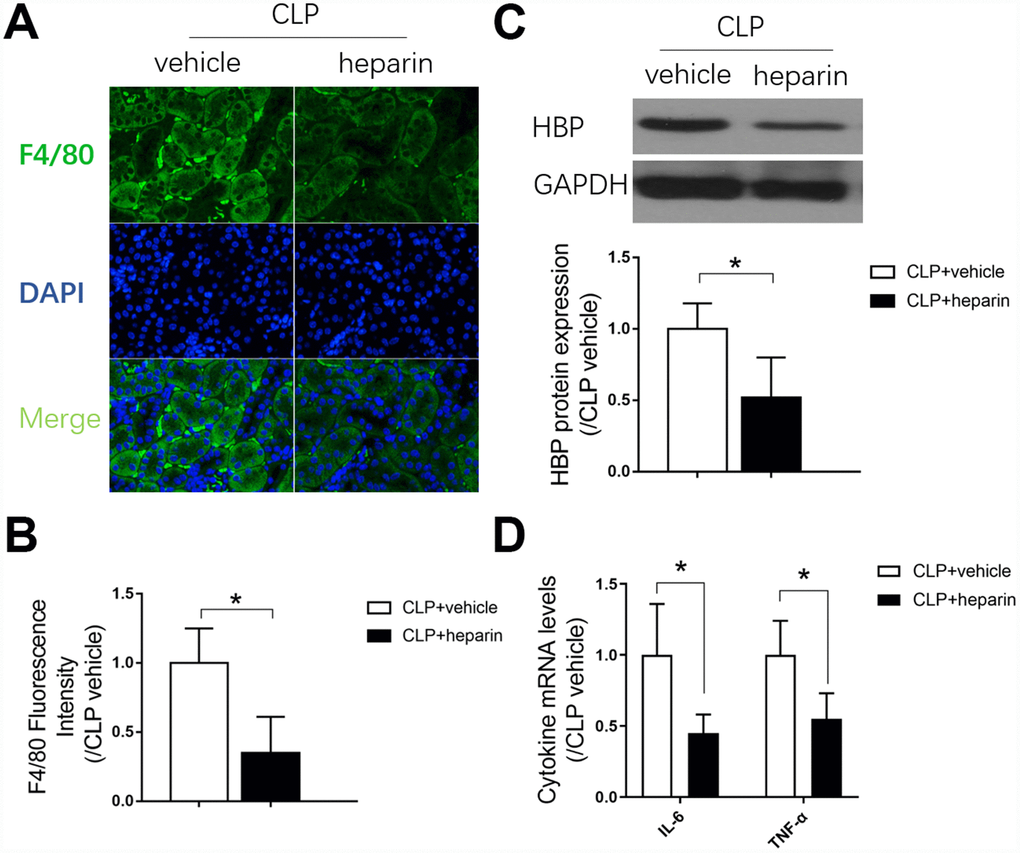 Macrophages are important components of the immune defense system. We performed F4/80 cell staining to evaluate macrophage infiltration into the septic kidneys, and found that F4/80 positivity greatly increased after CLP (Figure 4A and 4B). To confirm the involvement of macrophages in septic AKI, we injected mice with a macrophage infiltration inhibitor (heparin) 12 hours before the CLP procedure. Heparin inhibited macrophage infiltration into the septic kidneys (Figure 4A and 4B) and repressed heparin binding protein expression in kidney tissues (Figure 4C). As macrophages are the main immune cells that produce inflammatory cytokines, we measured the mRNA expression of inflammatory cytokines (Il-6 and tumor necrosis factor alpha [Tnf-α]) in the kidneys of mice treated with heparin or the vehicle before CLP. Heparin significantly reduced the expression of both cytokines (by nearly 50% compared with the CLP + vehicle group) (Figure 4D). These results indicated that macrophages infiltrated and produced inflammatory cytokines in septic kidneys, ultimately causing renal dysfunction.