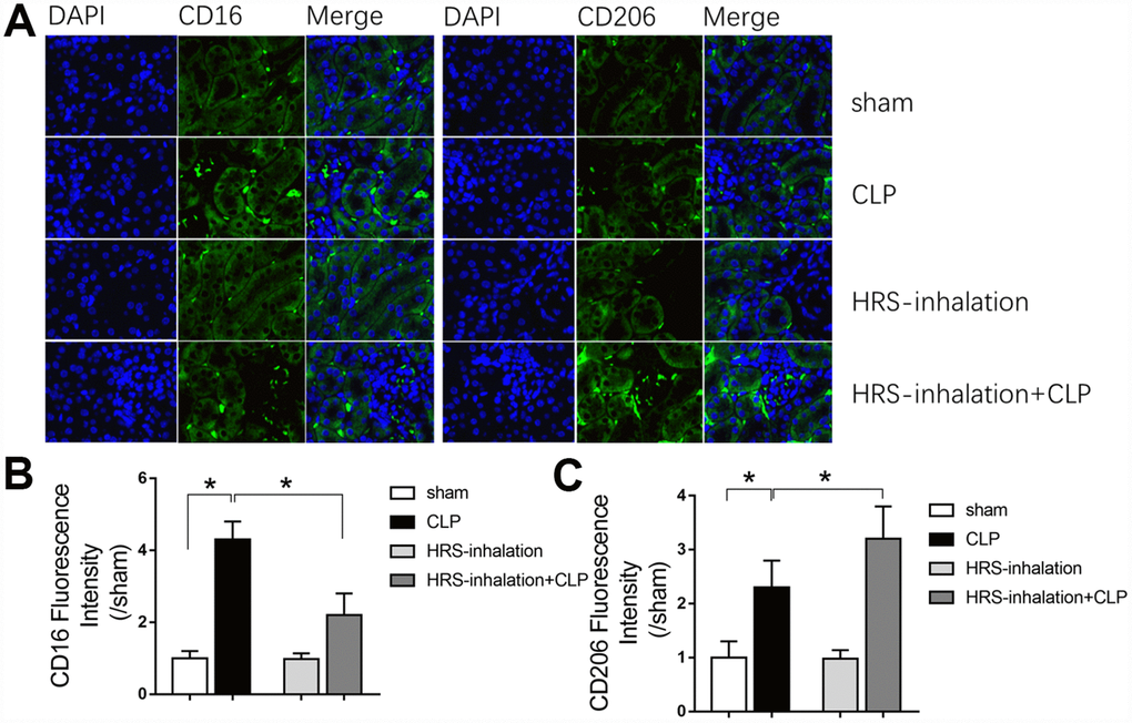 Having established the involvement of macrophages in kidney inflammation, we next assessed whether the renal protective effects of HRS inhalation were due to macrophage activity. We used CD16 and CD206 immunofluorescent staining to detect M1- and M2-type macrophage recruitment, respectively, in the kidneys of the four previously established groups of mice. As shown in Figure 5A, M1- and M2-type macrophages were both recruited to the septic renal cortex in the CLP group (P<0.05 vs. sham group); however, aerosol inhalation of the HRS altered macrophage polarization by greatly reducing the proportion of M1-type macrophages and increasing the proportion of M2-type macrophages in the renal cortex (P<0.05 vs. CLP group) (Figure 5A–5C). Aerosol inhalation of the HRS itself had no effect on macrophage polarization in the sham operation group. These results indicated that aerosol inhalation of the HRS may have reduced renal fibrosis by altering macrophage polarization and promoting M2-type macrophage recruitment.