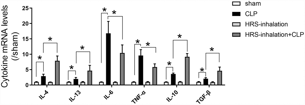 To explore the mechanism whereby aerosol inhalation of the HRS altered macrophage polarization in septic AKI, we assessed the mRNA levels of cytokines in renal tissues from the four groups of mice. The mRNA levels of Il-4, Il-13, Il-6, Tnf-α, Il-10 and transforming growth factor beta (Tgf-β) in the kidneys were significantly greater in the CLP group than in the sham group (P<0.05) (Figure 6). Il-4 and Il-13 levels were greater in the HRS inhalation + CLP group than in the CLP group. Importantly, M1 macrophage-associated pro-inflammatory cytokine (Il-6 and Tnf-α) mRNA levels were lower and M2 macrophage-associated anti-inflammatory cytokine (Il-10 and Tgf-β) levels were higher in the HRS inhalation + CLP group than in the CLP group (P<0.05) (Figure 6). These results suggested that aerosol inhalation of the HRS elevated Il-4 and Il-13 expression and shifted macrophage polarization toward M2 macrophage activation, ultimately changing the cytokine profile.