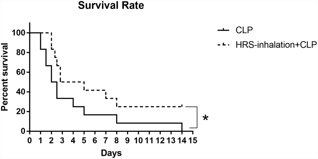 We then used Kaplan-Meier survival curves to estimate the survival rates of mice subjected to sepsis. The survival rate was higher in the HRS inhalation + CLP group (50%) than in the CLP group (33.3%) during the first 72 hours after the operation (Figure 7). All the mice in the CLP group died within 15 days, while 25% of the mice in the HRS inhalation + CLP group survived. Thus, the survival rate was significantly higher in the HRS inhalation + CLP group (P<0.05).