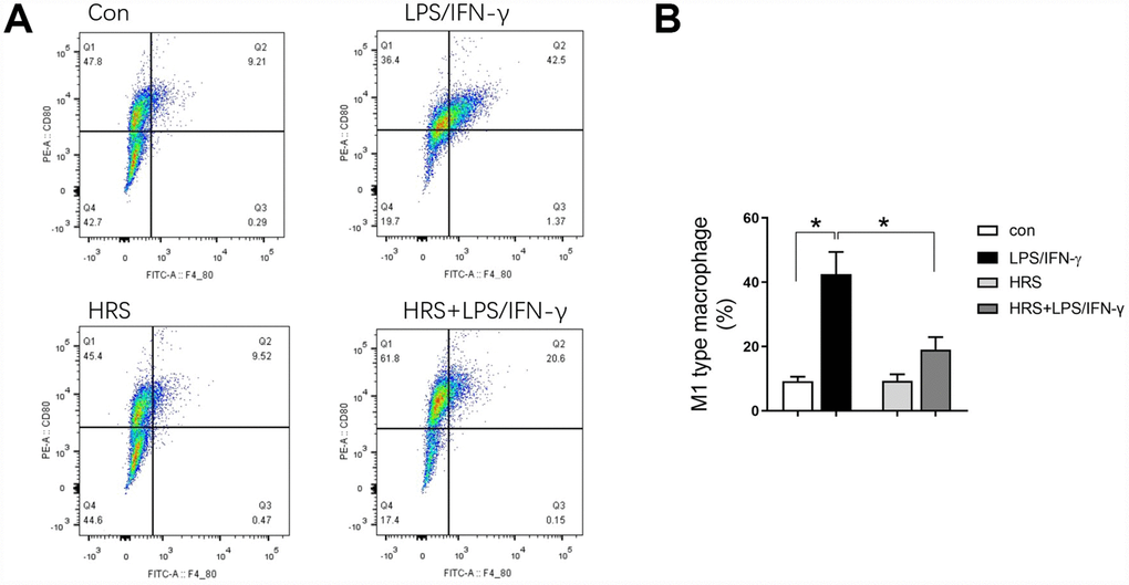 Part 5: RAW 264.7 cells in logarithmic growth phase were placed in six-well plates and divided into four groups: the control group, the induced M1-type macrophage group (LPS/IFN-γ group), the hydrogen-rich medium group (HRS group) and the induced M1-type macrophage and hydrogen-rich medium group (HRS + LPS/IFN-γ group). For the LPS/IFN-γ group, 1 μg/mL LPS and 20 ng/mL IFN-γ were added to the cells for 24 hours to induce their development into M1-type macrophages. The medium was replaced with hydrogen-rich medium before the same concentrations of LPS and IFN-γ were added to the cells of the HRS + LPS/IFN-γ group. Twenty-four hours after the treatment, the cells and supernatants were collected for flow cytometry and ELISA, respectively.