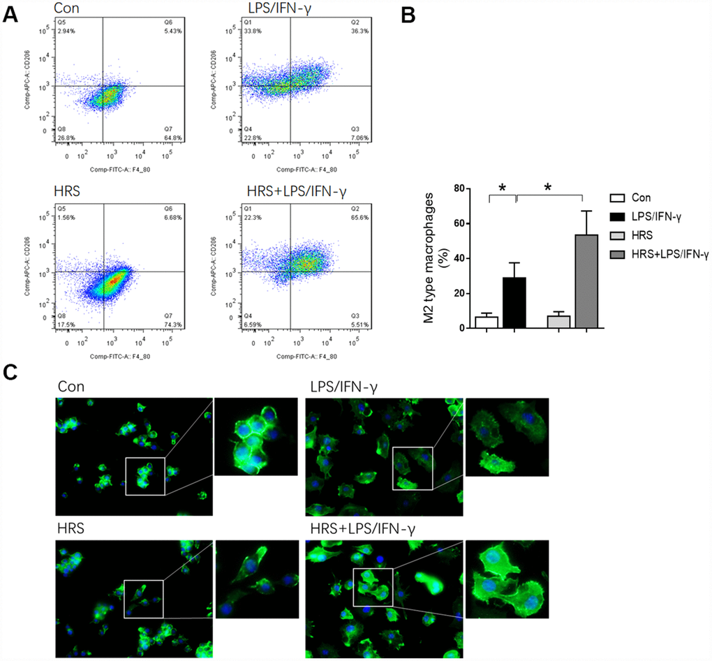 We then investigated the effects of hydrogen on macrophage polarization in vitro using RAW 264.7 cells. The cells were incubated in hydrogen-rich medium, and 1 μg/mL lipopolysaccharide (LPS) and 20 ng/mL interferon gamma (IFN-γ) were added to induce M1-type macrophage polarization. We then performed flow cytometry, using F4/80, CD80 as an M1 macrophage marker, and F4/80, CD206 as an M2 macrophage marker. A greater proportion of RAW 264.7 cells were polarized to M1- and M2-type macrophages in the LPS/IFN-γ treatment group than in the control group (P<0.05) (Figures 8A and 8B, 9A and 9B). However, the proportion of M1-type macrophages was significantly lower and the proportion of M2-type macrophages was significantly higher in the hydrogen-rich-medium-treated LPS/IFN-γ group than in the LPS/IFN-γ group (P<0.05). Moreover, fluorescent staining with ghostpen cyclopeptide revealed that the hydrogen-rich medium increased the capture ability of macrophages by enhancing the extensibility of their pseudopods (Figure 9C). These results were consistent with our in vivo findings, validating the notion that the HRS promoted macrophage polarization.