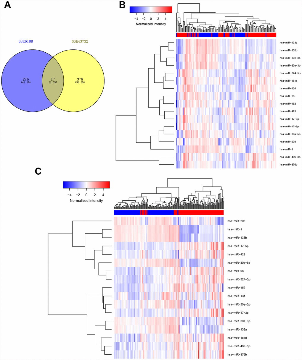 To identify miRNAs with prognostic potential in EC, we first analyzed data from two non-coding RNA profiling arrays released by GEO (ID: GSE43732, GSE6188) [15, 16]. Briefly, one comparison (cancer tissue vs adjacent normal tissue) was conducted in each of two arrays to find miRNAs which underwent expression changes from normal to malignant tissue. Differentially expressed miRNAs with larger changes (P< 0.05, Fold Change (FC)>1.5) [17] in both arrays were considered to be significantly altered. We found 17 miRNAs with remarkable differential expression between malignant and normal esophageal tissue, including miR-98, miR-133, and miR-30a-3 (Figure 1, Table 1 and Supplementary Tables 1, 2).
