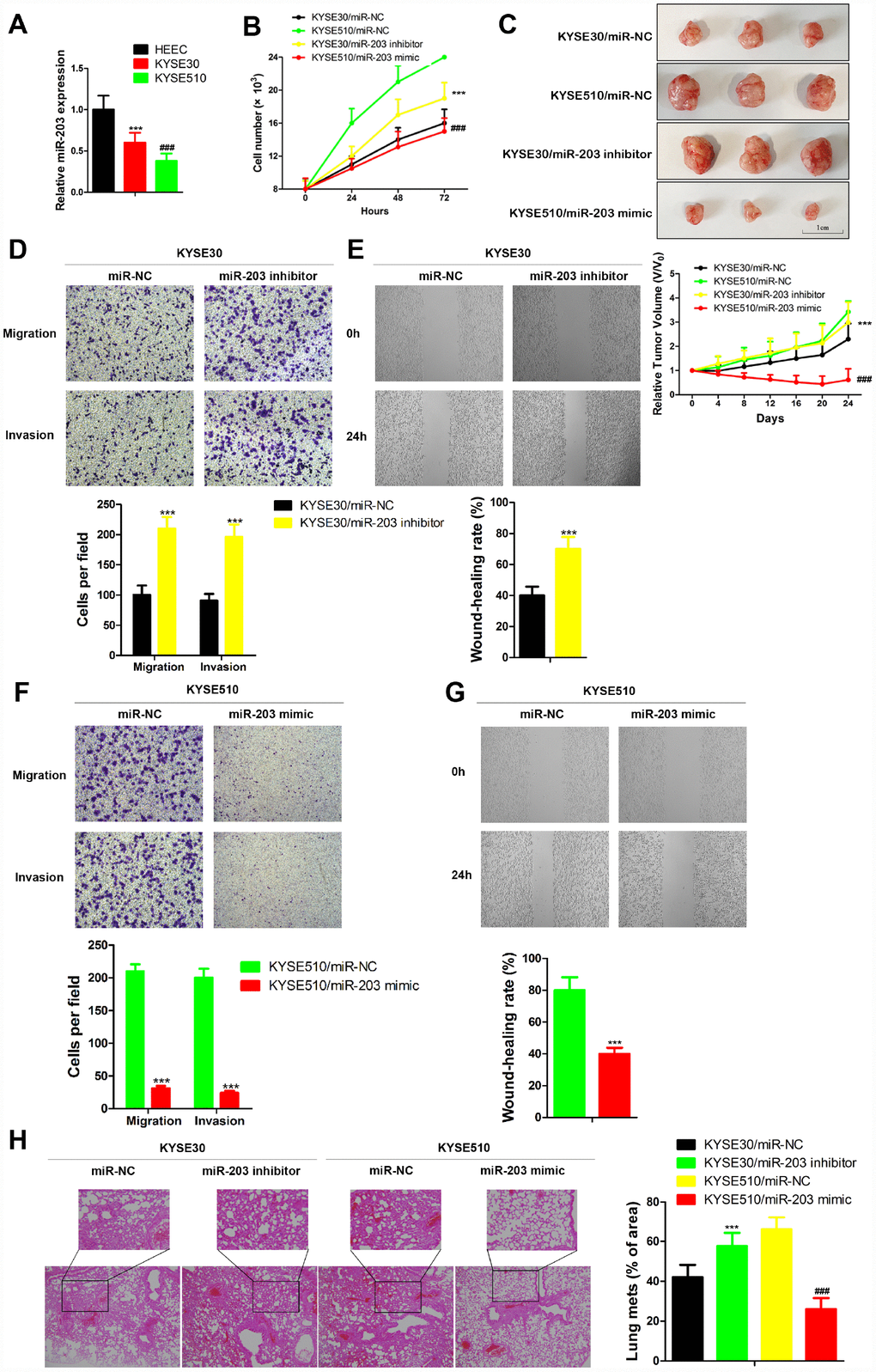 Here, we analyzed the expression of miR-203 in two human EC cell lines with different metastatic potential, KYSE30 (less metastatic potential) and KYSE510 (greater metastatic potential) [18]. The level of miR-203 was significantly decreased in both KYSE30 and KYSE510 compared to the normal esophageal cell line, HEEC (Figure 3A). Furthermore, KYSE510 cells had a much lower level of miR-203 than KYSE30 cells (Figure 3A). Then, KYSE30 and KYSE510 cells were transfected with miR-203 mimic or inhibitor. miR-203 inhibitor significantly increased proliferation of EC cells and introduction of miR-203 mimic led to an obvious defect in cell proliferation compared to the miR-NC group both in vivo and in vitro (Figure 3B and 3C). in vitro transwell and wound healing assays as well as in vivo experimental pulmonary metastasis assays showed that miR-203 inhibitor vigorously enhanced migration, invasion and pulmonary metastasis of KYSE30 cells, while miR-203 mimic produced the opposite results in KYSE 510 cells (Figure 3D–3H). In addition, miR-203 mimic almost completely inhibited in vivo experimental pulmonary metastasis of KYSE30 cells, while treatment with miR-203 inhibitor reduced pulmonary metastasis of KYSE510 cells (Supplementary Figure 3).