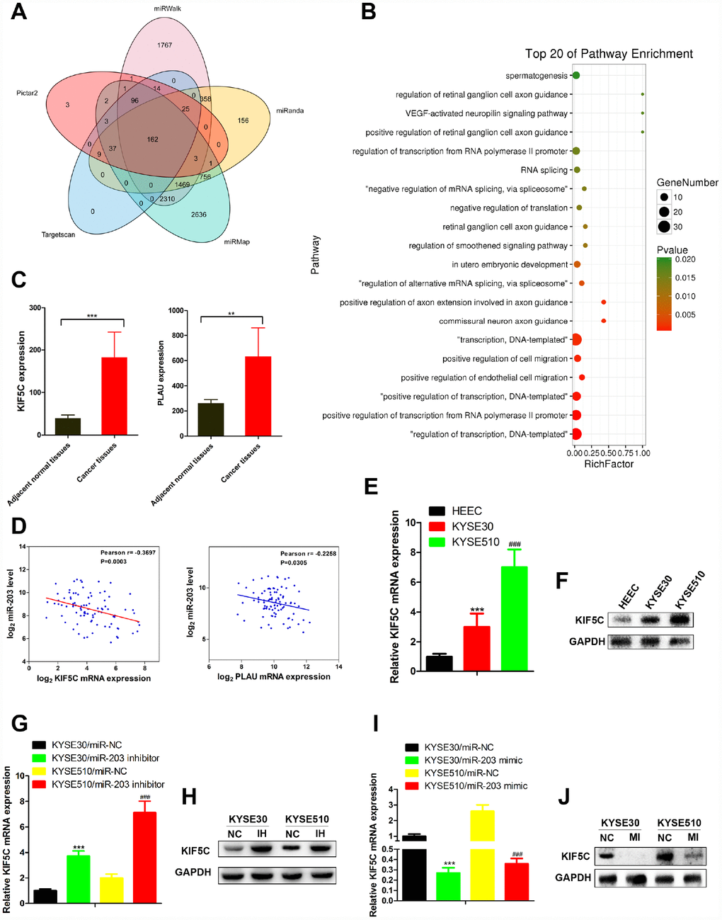 Next, we measured KIF5C mRNA and protein expression in EC cell lines in response to miR-203 mimic or inhibitor treatment. Contrary to miR-203 expression, both mRNA and protein expression of KIF5C were increased in EC cells compared with normal cells (Figure 4E, 4F). miR- 22 inhibitor vigorously up-regulated KIF5C in KYSE30 and KYSE510 cells (Figure 4G, 4H). In response to miR-203 mimic treatment, we observed a significant down-regulation of KIF5C mRNA and protein levels in both KYSE30 and KYSE510 cells (Figure 4I, 4J). Overall, these results demonstrate that KIF5C is a direct target of miR-203 in EC cells.