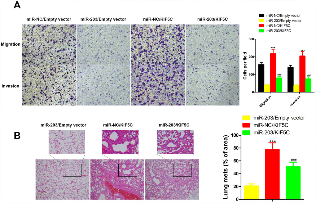To clarify the importance of KIF5C for miR-203-mediated inhibition of cell migration and invasion. KYSE510 cells were transfected with KIF5C-expressing plasmid with or without miR-203 mimic. We observed that the inhibitory effects of miR-203 mimic on cell migration and invasion of KYSE510 cells were partially compensated by overexpression of KIF5C in transwell and wound healing assay (Figure 5A). Our in vivo assay showed the same results (Figure 5B). These data suggest that KIF5C down-regulation might be one important cause for the decrease in cell migration and invasion observed upon miR-203 overexpression.