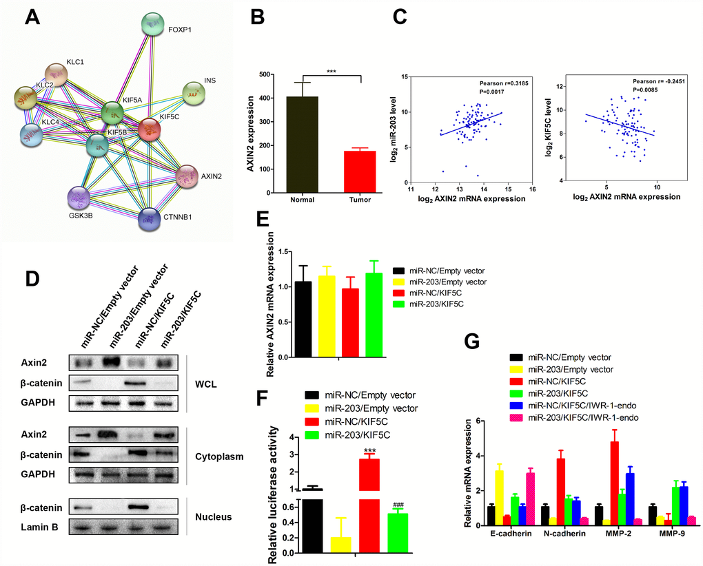 Overexpression of KIF5C in KYSE510 cells significantly increased of N-cadherin, MMP2 and MMP9 mRNA expression and suppressed E-cadherin expression (Figure 6G). However, the effect of KIF5C on these proteins was markedly reversed in the presence of miR-203 or IWR-1-endo, which induces the level of Axin2 and β-catenin degradation [21]. And, more importantly, miR-203 and IWR-1-endo showed synergistic effects on expression of E-cadherin, N-cadherin, MMP2 and MMP9 (Figure 6G). Thus, our data demonstrate that Axin2 is an essential indirect downstream molecule of miR-203.