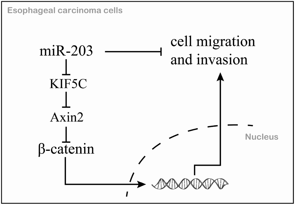 In summary, we identified miR-203 as a prognostic marker for EC. We further demonstrated that miR-203 inhibits cell migration and invasion via directly inhibiting KIF5C expression and thus enhances the antitumor activities of the downstream protein, Axin2 in EC (Figure 7). The features of this miR-203/KIF5C/Axin2 signaling arm support its exploration as a potential therapeutic target or prognostic biomarker for EC.