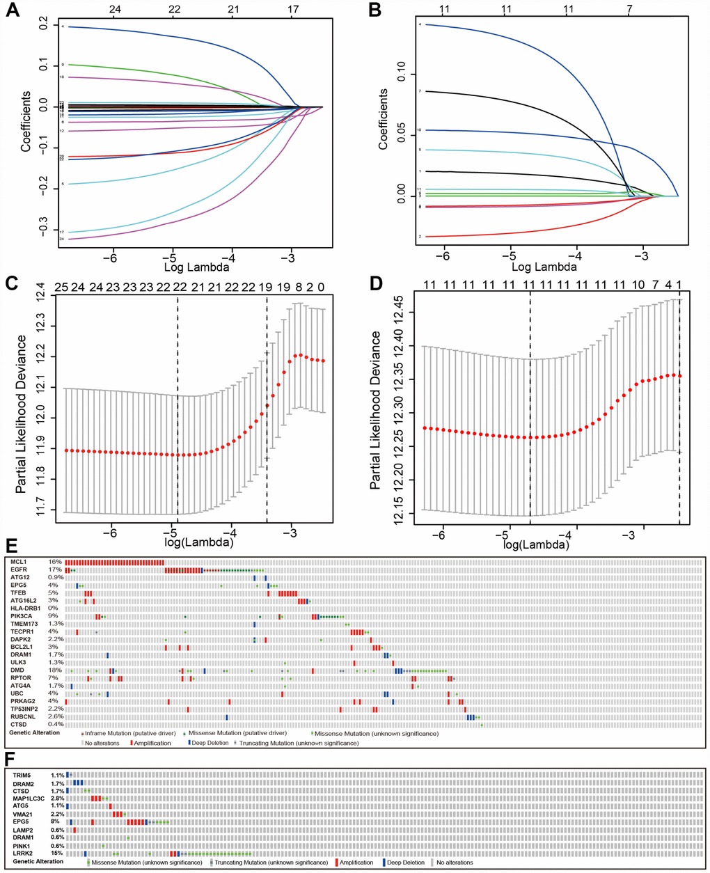 We searched genes associated with autophagy in the GeneCards database. A total of 149 autophagy-associated genes with relevance score >7 were chosen to generate prognostic gene signatures. XBP1 was removed due to a lack of expression in TCGA lung cohorts. Gene expression profiles of 148 genes in normal and tumor tissues were separately displayed for TCGA-LUAD and TCGA-LUSC cohorts in the heatmaps (Supplementary Figure 2). All these genes were subjected to univariate Cox regression analysis. A total of 25 and 11 genes were significantly associated with the OS of TCGA-LUAD (Figure 1A and 1C) and TCGA-LUSC (Figure 1B and 1D), respectively. These significant genes entered into LASSO COX regression analysis, and the regression coefficient was computed. Coefficient of each gene in LUAD was illustrated in Figure 2A. While 22 genes were included, the model achieved the best performance (Figure 2C). Similar analyses were performed for the TCGA-LUSC cohort, ending up with 11 genes significantly associated with survival (Figure 2B, 2D, and 2F). The functions, coefficients, and relevance scores of these genes were shown in Table 1, which included signal transduction molecules, components of autophagosome and lysosome, as well as enzymes facilitating the formation of autophagosomes.