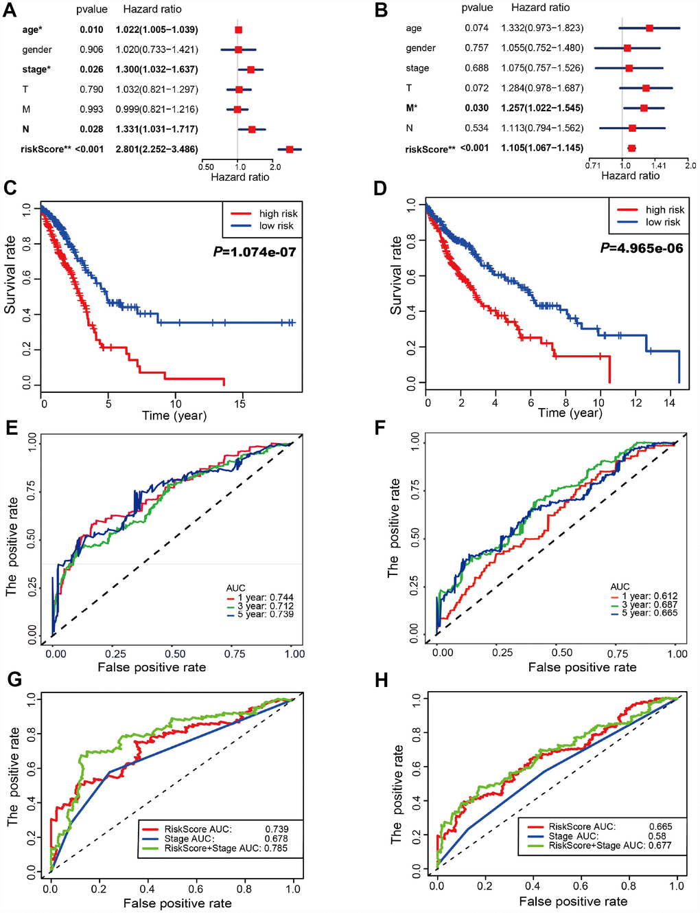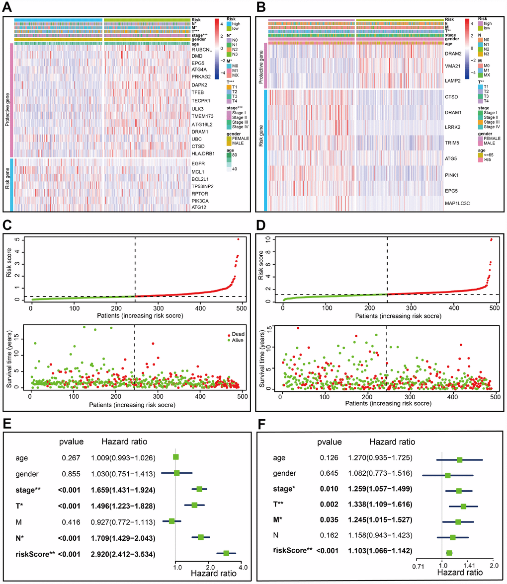 Risk scores were significantly associated with T, N, M, and clinical stage in TCGA-LUAD cohorts (Figure 3A). As illustrated, patients in the high risk group were more likely to express risk genes. In contrast, patients in the low risk group had a tendency to express protective genes (Figure 3A). The distributions of risk score of LUAD patients and the relationships between risk score and survival time were visualized in Figure 3C. Similar analyses were performed for TCGA-LUSC cohorts (Figure 3B and 3D). Following that, we evaluated the prognostic value of the risk score. Regarding TCGA-LUAD, risk scores were significantly associated with overall survival (OS) (HR=2.920, 95% CI=2.412-3.534, P<0.001) in the univariate analysis (Figure 3E). Multivariate analysis revealed that the risk score was an independent prognostic predictor (HR=2.801, 95% CI=2.252-3.486, P<0.001) (Figure 4A). Kaplan-Meier cumulative curves indicated that patients with low risk scores survived significantly longer than those with high risk scores (Figure 4C). The risk score was also associated with TCGA-LUSC cohort, as evidenced by univariate (HR=1.103, 95% CI=1.066-1.142, P<0.001) (Figure 3F) and multivariate (HR=1.105, 95% CI=1.067-1,145, P<0.001) Cox regression analyses (Figure 4B), as well as Kaplan-Meier survival curve (Figure 4D). The highest area under the curve (AUC) values of the risk score was 0.744 and 0.684 for the TCGA-LUAD and -LUSC cohorts, respectively (Figure 4E and 4F). Twenty-two autophagy-associated genes in LUAD were used for further analysis since they surpassed those genes in LUSC in predicting prognosis. The combination of stage and risk score could improve prognostic accuracy in TCGA-LUAD (Figure 4G) and TCGA-LUSC (Figure 4H) when compared to the stage or risk score alone.