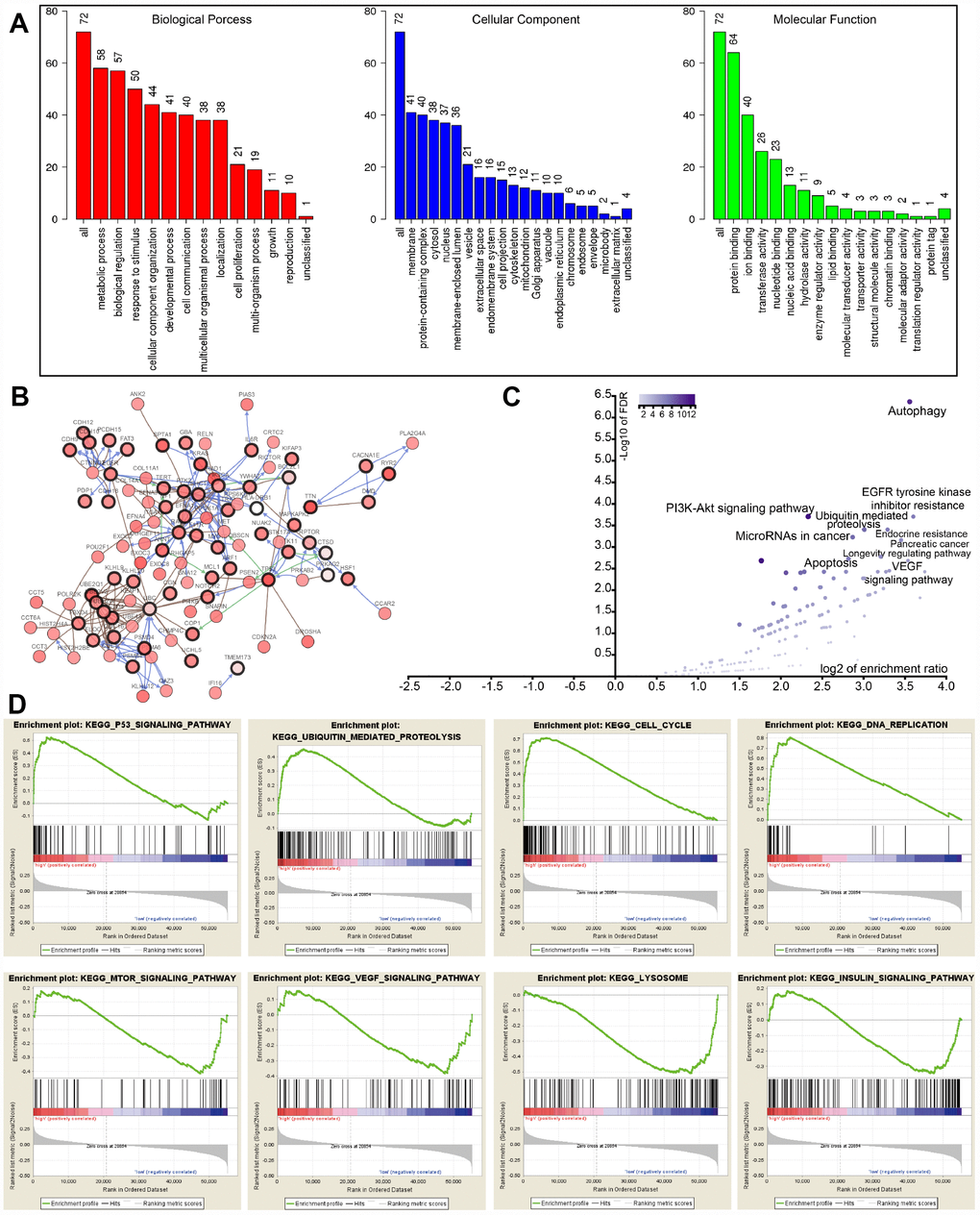 To interrogate potential signaling pathways related to the 22 autophagy-associated genes in lung cancer, we used them as baits to hook 50 most frequently changed neighbor genes in the TCGA-LUAD cohort (http://www.cbioportal.org). GO analysis indicated that these genes could be categorized into several essential biological processes, including biological regulation, response to the stimulus, developmental process, cell proliferation, cell proliferation, and growth (Figure 5A). These genes were linked and formed a tight protein-protein interaction network as indicated in Figure 5B (https://string-db.org/). KEGG analysis showed that the 72 genes were mainly associated with autophagy, apoptosis, EGFR tyrosine kinase inhibitor (TKI) resistance, ubiquitin-mediated proteolysis, PI3K-Akt signaling pathway, and VEGF signaling pathway (Figure 5C). The log2 of enrichment ratio and -log10 of FDR were visualized in the volcano plot (Figure 5C). Fold changes of mRNA expression levels of all protein-coding genes between high and low risk LUAD groups were calculated and pre-ranked from high to low. GSEA analysis unveiled that altered genes were significantly enriched in several common pathways (Figure 5D). We found that the high risk group was significantly associated with the cell cycle (NES=2.80, P<0.0001), p53 signaling pathway (NES=1.937, P=0.0039), DNA replication (NES=1.90, P=0.0059), and ubiquitin-mediated proteolysis (NES=1.703, P=0.017). Meanwhile, the low risk group was negatively associated with mTOR (NES=-1.526, P=0.045), VEGF (NES=-1.529, P=0.033), and insulin (NES=-1.424, P=0.044) signaling pathways, as well as lysosome (NES=-1.747, P=0.024).