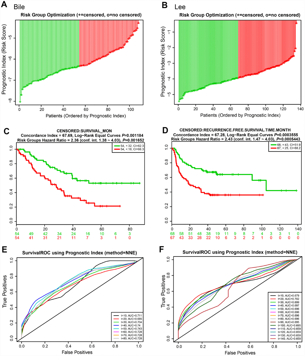 We next evaluated the predictive power of the prognostic gene signature in the different lung cancer cohorts from the GEO database [16]. In each cohort, patients were separated into low and high risk groups based on the calculated risk score, and the OS of the two groups was compared. Okayama cohort consisted of 226 patients with primary stage I-II lung adenocarcinoma (GSE31210) [17] (Figure 6). Risk scores of patients spanned from -58 to -53 (Figure 6A). Patients at low risk survived significantly longer than those in high risk (HR=4.55, 95% CI=1.99-10.42, P=0.0003416, and maximum AUC=0.795) (Figure 6C and 6E). Rousseaux cohort included 293 patients with stage I-IV lung cancer (GSE30219), consisting of 71 adenocarcinomas, 61 squamous cell tumors, 56 large cell neuroendocrine tumors, 39, Basaloid tumors, 24 carcinoid tumors, 21 small cell carcinoma, and 7 other histology [18]. Risk scores ranged from -19 to -15 (Figure 6B). The risk scores performed well, even in this mixed lung cancer cohort (HR=2.32, 95% CI=1.69-3.18, P=2.173e-07, maximum AUC=0.789) (Figure 6D and 6F). In the Bild cohort of 109 lung cancer patients (GSE3141) [19], patients with smaller risk scores outperformed those with high risk in survival (HR=2.36, 95% CI=1.38-4.03, P=0.001652, maximum AUC=0.743) (Figure 7A, 7C, and 7E). Lastly, Lee’s study (GSE8894) was performed in 138 patients with stage IA-IIIB postoperative NSCLC (adenocarcinoma and squamous cancer cell lung cancer) [20]. Patients in the low risk group exhibited longer OS than the high risk group (HR=2.43, 95% CI=1.47-4.03, P=0.0005443, maximum AUC=0.702) (Figure 7B, 7D, and 7F). Overall, these results confirmed that this 22-autophagy gene signature was also predictive of survival in the independent validation lung cohorts.