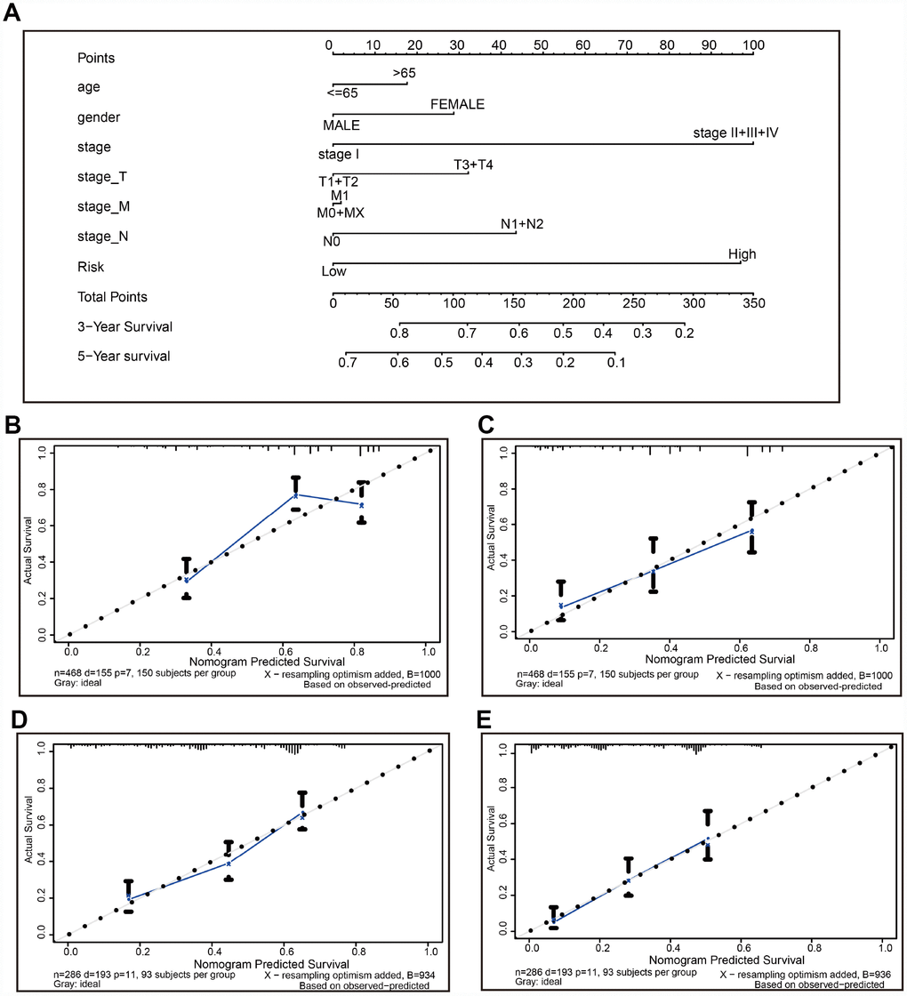Age, gender, stage, T, N, M, and risk score were used to construct a nomogram, using the survival and the rms package for R. Following that, calibration curves were plotted to evaluate the concordance between actual and predicted survival. Moreover, the concordance index (C-index), ranging from 0.5 to 1.0, was computed to assess the model performance for predicting prognosis was measured. The value of 0.5 and 1.0 represents a random chance and an excellent capacity for predicting survival with the model, respectively.