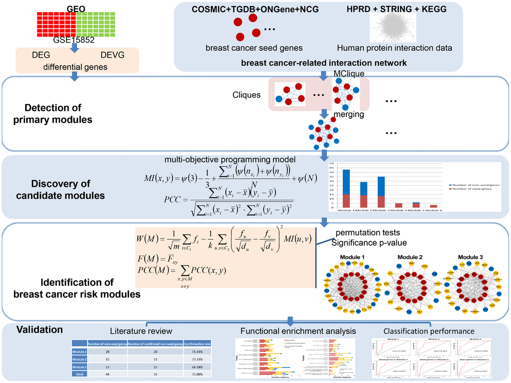 In this paper, an integrated strategy was proposed to identify breast cancer risk modules according to a multi-objective programming model and significance in three scores. A total of 3 breast cancer risk modules were identified. ~70% non-seed genes in these risk modules were confirmed to play vital roles in the development, pathogenesis or signaling of breast cancer and could act as potential breast cancer genes. Most genes in our risk modules, including unconfirmed non-seed genes, were enriched in breast cancer-related pathways or functions. These risk modules could distinguish between breast tumor and normal samples with higher accuracy than seed genes in risk modules. These results indicated the disease association of breast cancer risk modules identified by our integrated strategy.