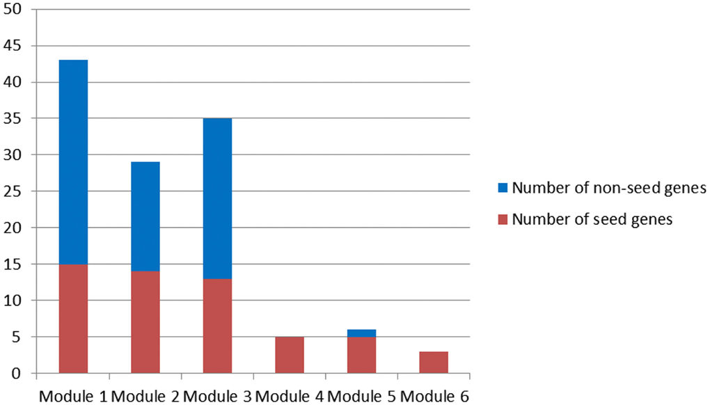 Since only seed genes were contained in Module 4 and 6, Module 1-3 and 5 were candidate modules for breast cancer risk module identification.