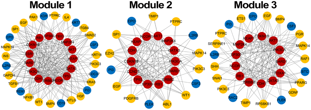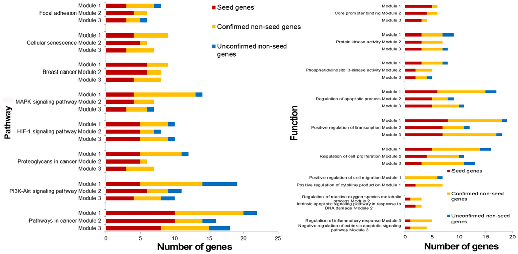 A literature review was carried out using the online database PubMed (https://www.ncbi.nlm.nih.gov/pubmed) for non-seed genes in 3 breast cancer risk modules. It was showed that 75% (33/44) non-seed genes were associated with breast cancer (~70% for each module, Table 2), demonstrating disease association of risk modules identified by our integrated strategy.