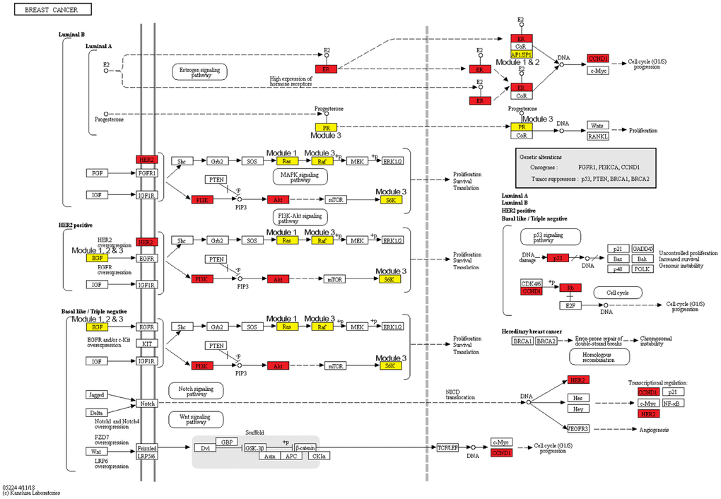 Breast cancer risk modules were enriched in numerous pathways and functions, especially breast cancer-related ones (Figure 5). It was worth noting that genes from all three risk modules, including seed genes and non-seed genes, were enriched in the “breast cancer” pathway (Figure 6), indicating their roles in the process of breast cancer. Different locations of genes from different modules demonstrated various functions of modules.