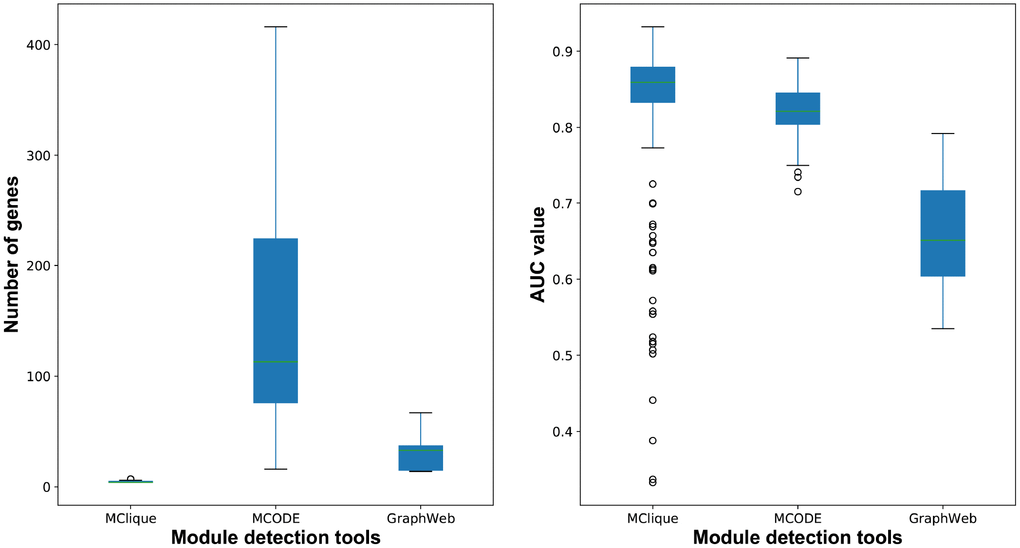 For the purpose of primary modules detection, cliques of the breast cancer-related interaction network were mined using Cytoscape MClique in our integrated strategy. MCODE and GraphWeb were also taken into consideration for primary module detection. It was showed that the number of genes in cliques/modules mined by MClique, MCODE and GraphWeb had great difference, while classification accuracy varied among the three module sets (Figure 9). Since cliques mined by MClique were smaller with more connections, larger AUC values and more similar genes, they were used for primary module detection in our integrated strategy.