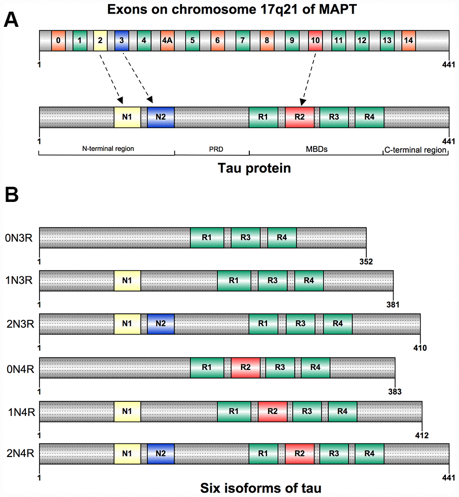 Tau was first isolated and named in 1975 for its ability to induce tubule formation [12], and was mostly segregated into neuronal axons [13]. Tau can be also detected in oligodendrocytes and neuronal somatodendritic compartments [14]. Besides the nervous system, tau was also found to be expressed in many other tissues: heart, lung, kidney, and testis, but less abundant [15]. Tau is composed of four regions: an N-terminal projection region, a proline-rich domain (PRD), a microtubule-binding domain (MBD), and a C-terminal region [16] (Figure 1A). Six isoforms of tau have been found in human adult brain, they are expressed by alternative splicing around the N-terminal projection region and MBD. The gene expression of these isoforms differs both in N-terminal exons (0N, 1N, or 2N) and the number of microtubule binding repeat sequences (3R or 4R). The 4R tau has four microtubule binding repeat sequences due to the inclusion of exon 10 when compared with 3R tau [4, 17] (Figure 1B).