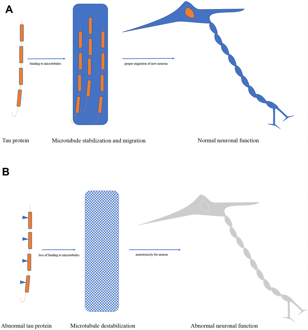 The mainly physiological tau function in the cell is regulating microtubule structure and dynamics by binding to microtubules, it has been also proven in cell-free conditions [12]. Furthermore, the dynamic microtubule network provided by tau is key to the proper migration of new neurons, and severe reduction of adult neurogenesis was found in tau knockout mice [18]. Tau also plays an important role in controlling the balance of microtubule-dependent axonal transport through the differential sensitivity of motor proteins in neurons [19]. Additionally, it has been approved that tau is essential in the protection of neuronal genomic DNA and RNA integrity under hyperthermia condition both in primary neuronal cultures and in vivo in adult mice [20]. Besides, absence or reduction of tau expression has been reported to have protective efforts against memory deficits, excitotoxicity, amyloid induced toxicity, and epilepsy in animal experiments [21, 22] (Figure 2).