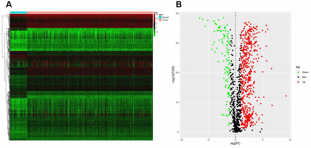 The mRNA levels of 2498 IRGs in ccRCC (n = 539) and normal kidney tissues (n = 72) in The Cancer Genome Atlas (TCGA) were examined, and these values were compared through the Wilcoxon signed-rank test. This analysis revealed 681 differentially expressed IRGs (DEIRGs), including 565 genes that were upregulated and 116 genes that were downregulated in ccRCC tissues compared with normal kidney tissues (false-discovery rate [FDR] < 0.05, |log2 fold-change [FC]| > 1) (Figure 1).