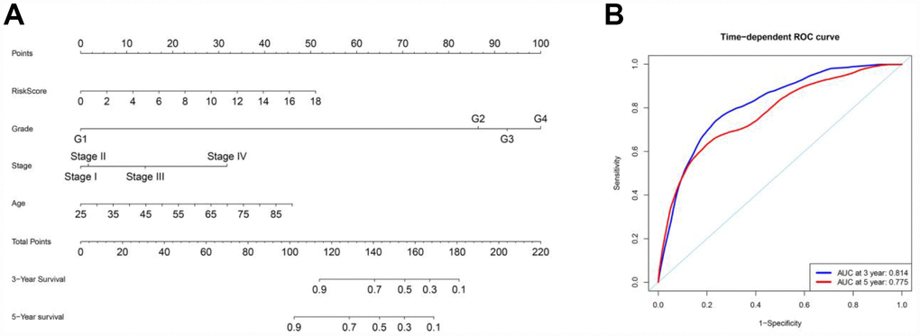 To better predict the prognosis of ccRCC patients at three and five years post-surgery, we constructed a new nomogram from the variables associated with OS (age, histological grade, pathological stage and risk score) (Figure 10A). ROC curve analysis was used to evaluate the accuracy of the nomogram. The nomogram could accurately predict OS at three and five years post-surgery, with AUCs of 0.814 and 0.775, respectively (Figure 10B).