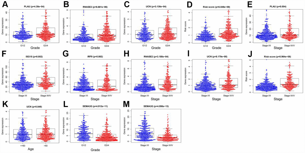 To examine the ability of our model to predict the progression of ccRCC, we analyzed the relationships between the risk factors from our model (the risk score and risk genes) and the clinical variables (age, gender, histological grade and pathological stage) in the entire TCGA cohort. As the values of certain factors increased (PLAU, RNASE2 and UCN levels and the risk score), the histological grade of ccRCC patients increased (all p < 0.05) (Figure 11A–11D), and as the values of other factors increased (PLAU, ISG15, IRF9, RNASE2 and UCN levels and the risk score), the pathological stage of ccRCC patients increased (all p < 0.05) (Figure 11E–11J). The expression of UCN was higher in patients > 60 years old than in those ≤ 60 years old (p < 0.05) (Figure 11K). In contrast, as SEMA3G expression increased, the values of two clinical variables (histological grade and pathological stage) decreased (both p < 0.05) (Figure 11L and 11M) (Table 2). These results demonstrated that the dysregulation of immune-related risk gene expression is associated with the development of ccRCC.