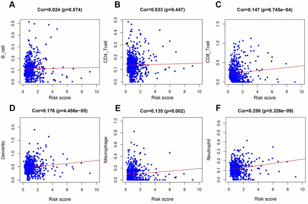 Previous studies have demonstrated that immune infiltration is an important determinant of the therapeutic responsiveness and prognosis of ccRCC [19, 20]. Şenbabaoğlu et al. found that reduced contents of certain immune cells (such as Th17 cells) were associated with the progression of ccRCC and a poor patient prognosis [21]. George et al. reported that the disease-free survival of patients with high CD8+ T-cell densities could be significantly prolonged through the use of sunitinib therapy [22]. Therefore, we also analyzed the relationship between the risk score from our model and immune cell infiltration, and found that the risk score correlated positively with the infiltration of certain immune cells (CD8+ T cells, neutrophils, macrophages and dendritic cells). These results also verified the reliability of the model in predicting the prognosis of ccRCC.