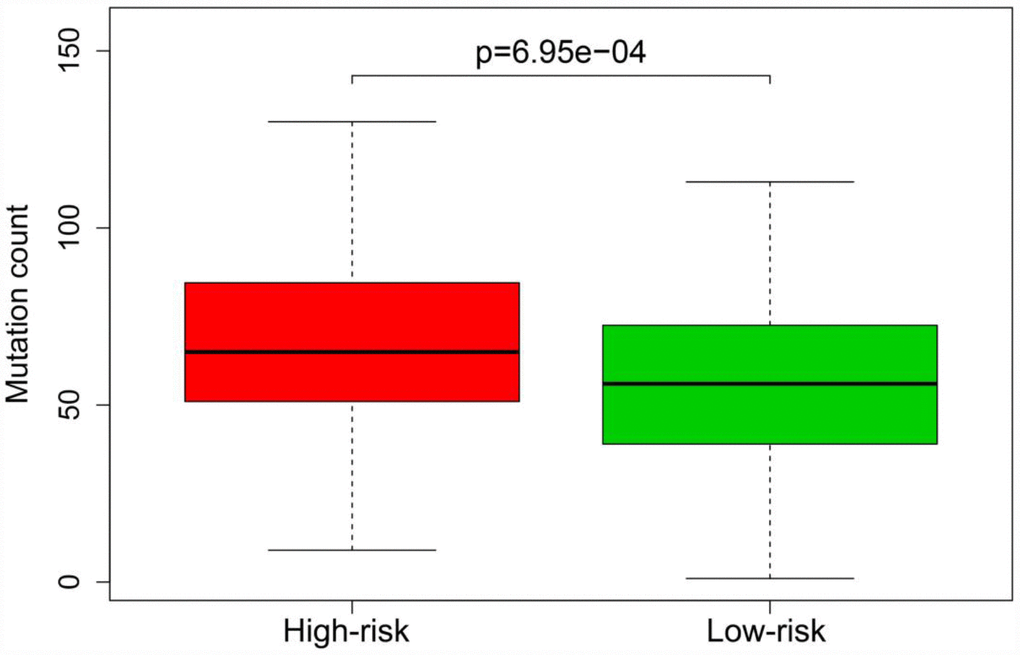 Previous studies have indicated that the tumor mutation burden is significantly associated with the clinical effectiveness of immunotherapy [12]. To assess whether our model could stratify patients with different sensitivities to immunotherapy, we compared the mutation counts of the high-risk and low-risk groups in the entire TCGA cohort. The mutation count was greater in the high-risk group than in the low-risk group (p < 0.05) (Figure 13).