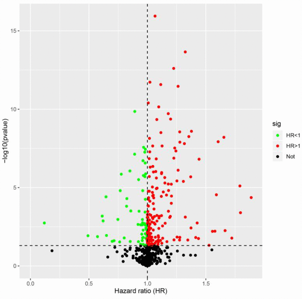 To identify possible prognostic DEIRGs (PDEIRGs), we performed a univariate Cox regression analysis of the expression of each DEIRG in the entire TCGA cohort. In total, 263 DEIRGs were found to be significantly associated with the overall survival (OS) of ccRCC patients (p < 0.05) (Figure 2).