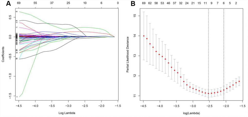The 530 patients were randomly divided into two cohorts: a training cohort (n = 266) and a testing cohort (n = 264) (Table 4). The training cohort was used to construct the Cox regression hazards model, and the testing cohort was used to test the performance of the model. Initially, univariate Cox analysis was used to identify possible PDEIRGs. Next, Lasso regression was used to select potential risk genes and eliminate genes that would overfit the model. Finally, we used Cox proportional hazards regression to construct a prognostic risk model.