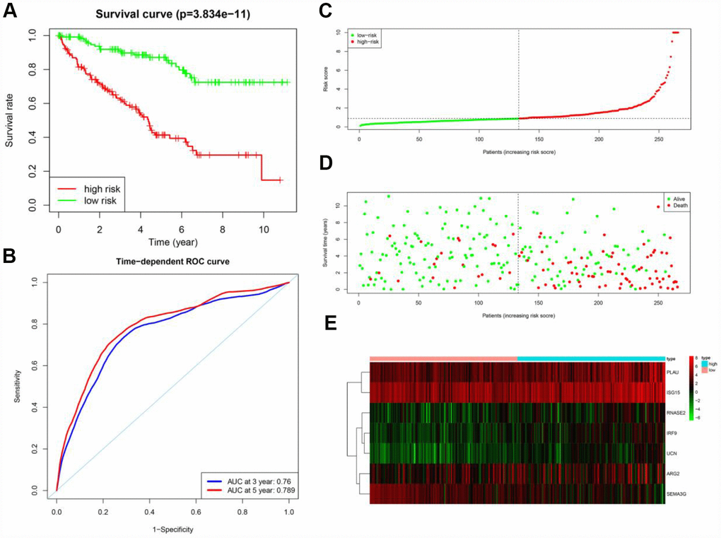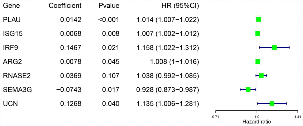 Training cohort risk score = (0.0142 × expression of PLAU) + (0.0068 × expression of ISG15) + (0.1467 × expression of IRF9) + (0.0078 × expression of ARG2) + (0.0369 × expression of RNASE2) + (-0.0743 × expression of SEMA3G) + (0.1268 × expression of UCN).