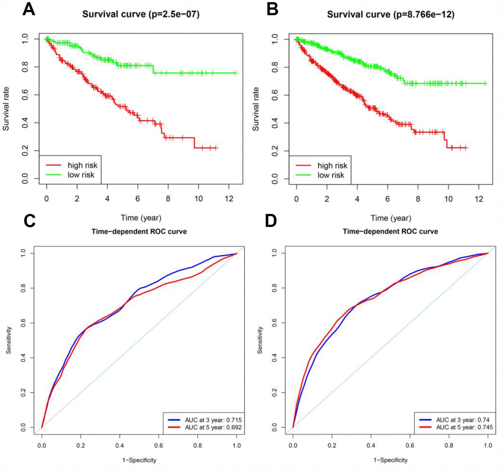 Next, Kaplan-Meier survival analysis was used to determine the prognostic differences between the high-risk and low-risk groups. The Kaplan-Meier survival curves differed significantly between the two risk groups in both the testing cohort and the entire TCGA cohort (p < 0.05) (Figure 7A and 7B); throughout the follow-up time, the survival rate was higher in low-risk patients than in high-risk patients. In the testing cohort, the survival rates at three and five years in the high-risk group were 66.2% and 51.7%, respectively, while the corresponding rates in the low-risk group were 89.0% and 81.0%, respectively. In the entire TCGA cohort, the survival rates at three and five years in the high-risk group were 66.3% and 50.8%, respectively, while the corresponding rates in the low-risk group were 89.2% and 80.6%, respectively. ROC analyses were performed for the testing cohort and the entire TCGA cohort at three and five years. In the testing cohort, the AUCs at three and five years were 0.715 and 0.692, respectively. In the entire TCGA cohort, the AUCs at three and five years were 0.740 and 0.745, respectively (Figure 7C and 7D).