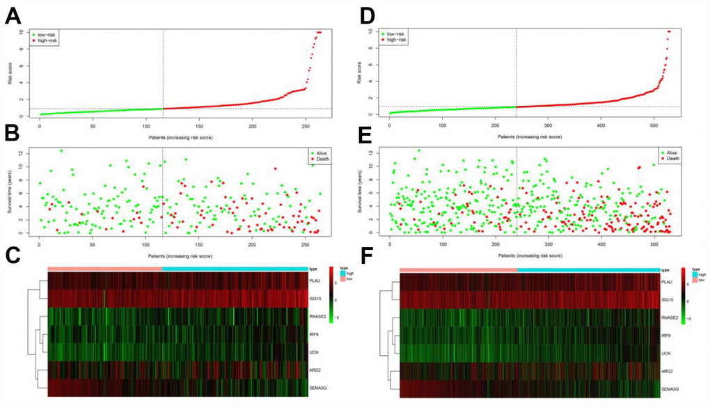 To verify the accuracy of the prognostic risk model, we used it to analyze the testing cohort (the remaining 264 patients from the 530 total) and the entire TCGA cohort. First, we used the seven risk genes (PLAU, ISG15, IRF9, ARG2, RNASE2, SEMA3G and UCN) to calculate the risk score of each patient in the testing cohort and the entire TCGA cohort. The patients in each cohort were then classified into two groups based on the median risk score of the training cohort. In the testing cohort, 148 patients were categorized as high-risk and 116 were categorized as low-risk. In the entire TCGA cohort, 290 patients were classified as high-risk and 240 were classified as low-risk.
