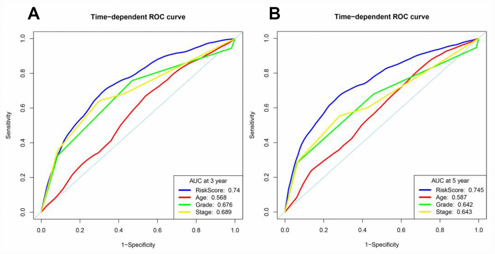 We then assessed whether the risk score from our model was more accurate than the other clinical parameters (age, histological grade and pathological stage) in predicting OS at three and five years. Indeed, the risk score was more accurate than the other clinical parameters: the AUCs at three years for age, histological grade and pathological stage were 0.568, 0.676 and 0.689, respectively (Figure 9A), and the corresponding values at five years were 0.587, 0.642 and 0.643, respectively (Figure 9B).