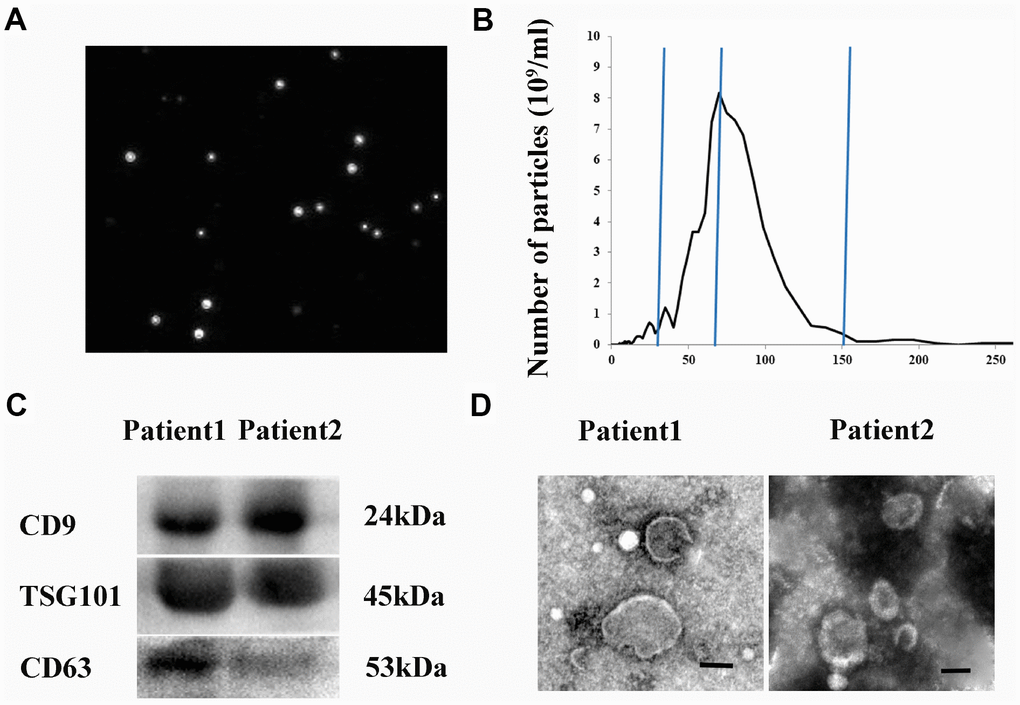 We isolated and characterized exosomes derived from hematomas from CSDH patients. NanoSight particle tracking analysis was performed to evaluate exosome size and particle number (Figure 1A). The diameters of the exosomes ranged from 30–150 nm (peak at 74 nm) (Figure 1B). Exosomes expressed typical exosomal markers including CD9, CD63, and TSG101 (Figure 1C). Finally, exosome morphology was evaluated using transmission electron microscopy (TEM) (Figure 1D).
