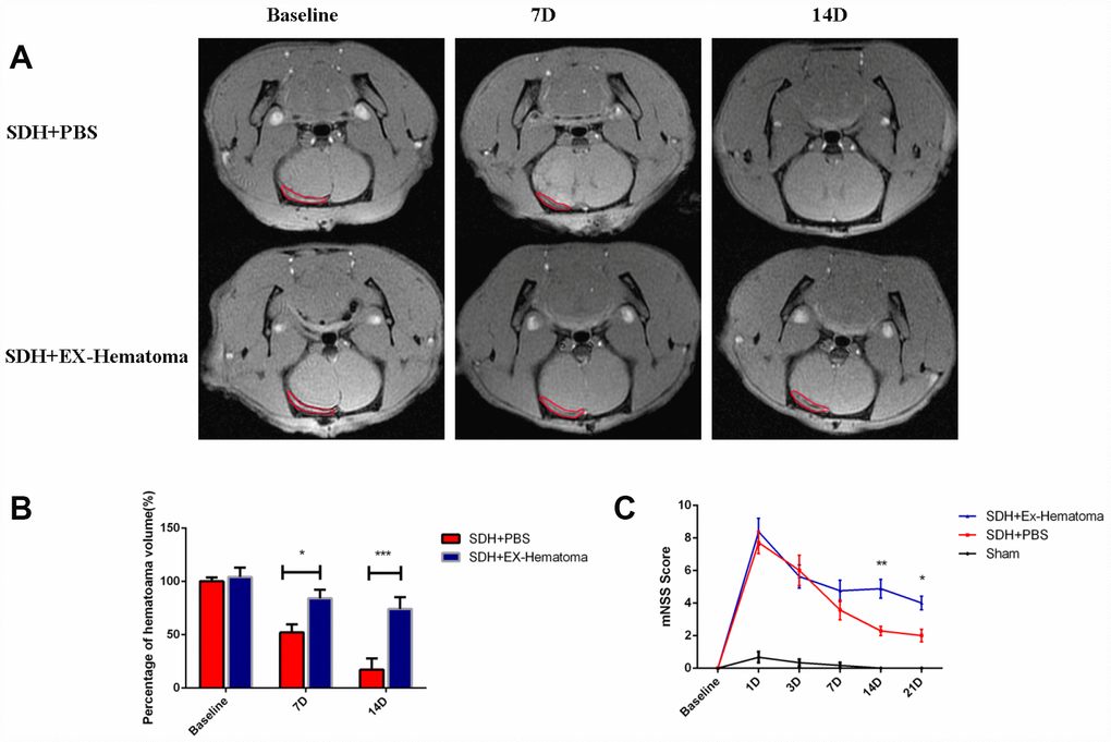 We evaluated the effects of hematoma-derived exosomes on hematoma absorption and neurological function in a rat model of acute SDH. Magnetic resonance imaging (MRI) was performed to assess hematoma volume at baseline and at 7, 14, and 21 days after injection of the exosomes (Figure 2A). No differences in hematoma volume were observed among rats treated with hematoma-derived exosomes (EX-Hematoma group) compared to controls (PBS group) at baseline (Figure 2B). However, higher hematoma volumes were observed in the EX-Hematoma group compared to controls 7 and 14 days after injection (Figure 2B). We evaluated neurological deficits using the Modified Neurological Severity Score (mNSS). The mNSS scores were higher in SDH rats compared to controls (sham), consistent with previous studies [25]. We found that the mNSS scores were higher in the EX-Hematoma group compared to controls 14 and 21 days after injection (Figure 2C).