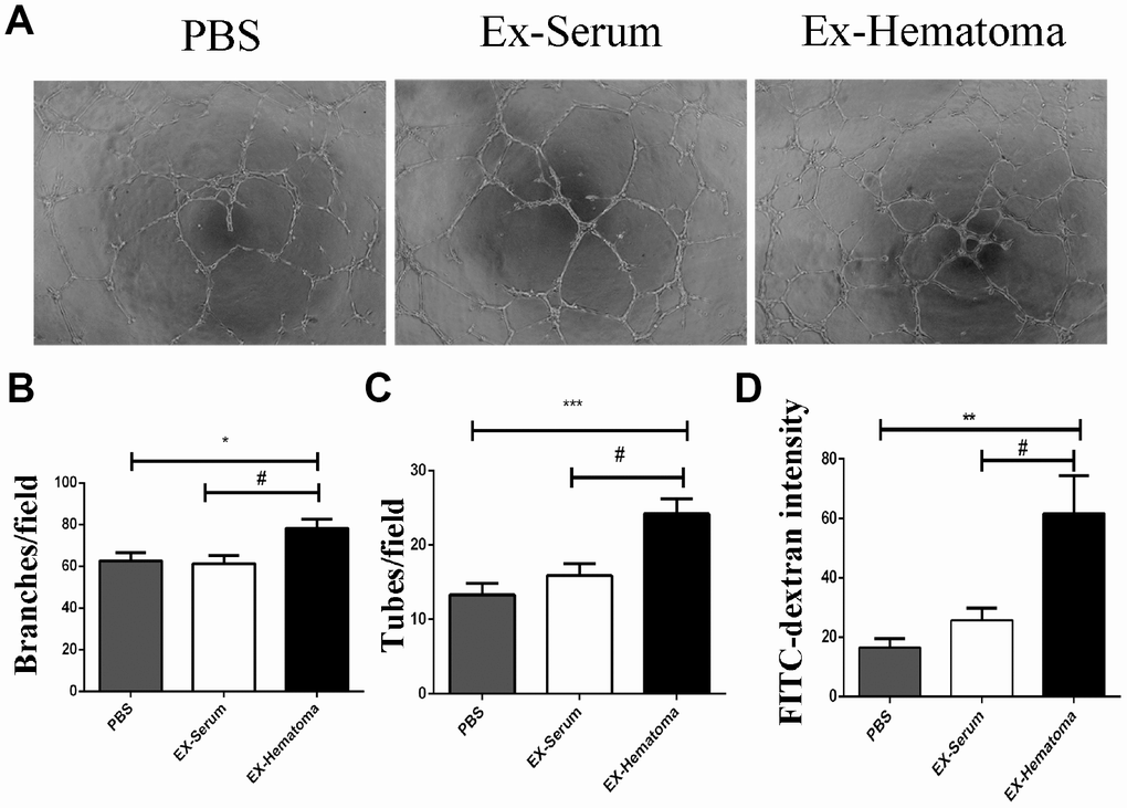 Angiogenesis plays an important role in the pathogenesis of SDH [25]. We therefore investigated the effects of hematoma-derived exosomes on angiogenesis in HUVECs using in vitro tube formation assays. We observed an increase in branches and tubes in HUVECs treated with hematoma-derived exosomes (EX-Hematoma group) compared to those treated with serum-derived exosomes (EX-serum group) and those treated with PBS (control group) (Figure 3A–3C). We also investigated the effects of the exosomes on the permeability of HUVEC monolayers in vitro. The intensity of the FITC-Dextran was higher in the EX-Hematoma compared to EX-Serum group, indicating hematoma-derived exosomes increased vascular permeability (Figure 3D).