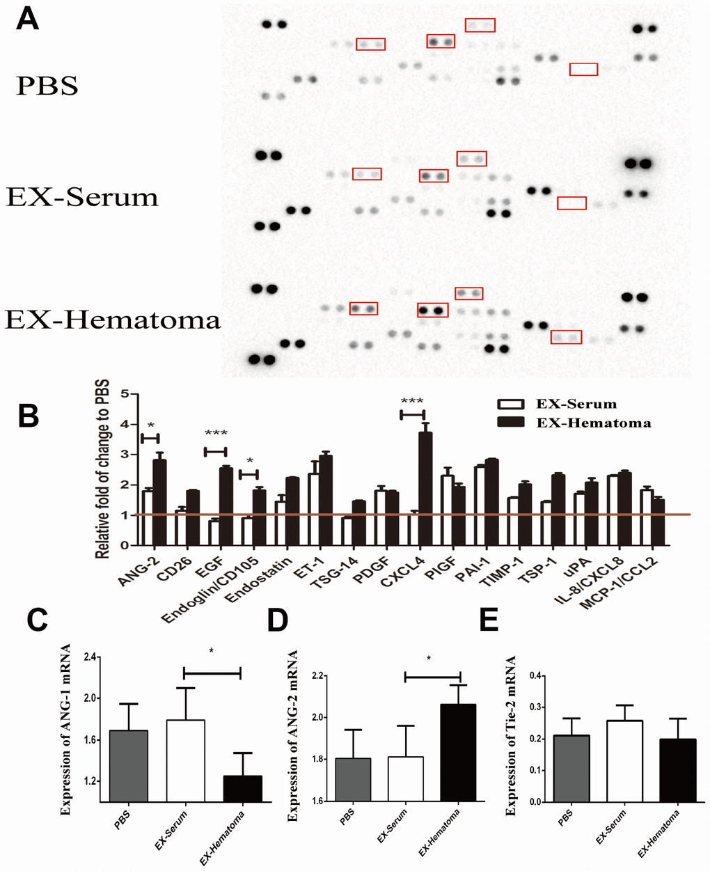 We next investigated the effects of the exosomes on the expression of angiogenesis-related cytokines. Hematoma-derived exosomes were co-cultured with HUVECs for 24 hrs and the expression of angiogenesis-related cytokines was quantified using cytokine arrays. ANG-2, EGF, Endoglin, and CXCL4 expression were higher in HUVECs treated with hematoma-derived exosomes (EX-Hematoma group) compared to those treated with serum-derived exosomes (EX-Serum group) (Figure 4B). Interestingly, ANG-2 mRNA expression was higher while ANG-1 expression was lower in the EX-Hematoma compared to EX-Serum group (Figure 4C and 4D). However, no differences in Tie-2 (angiopoietin receptor) mRNA expression were observed between groups (Figure 4E).