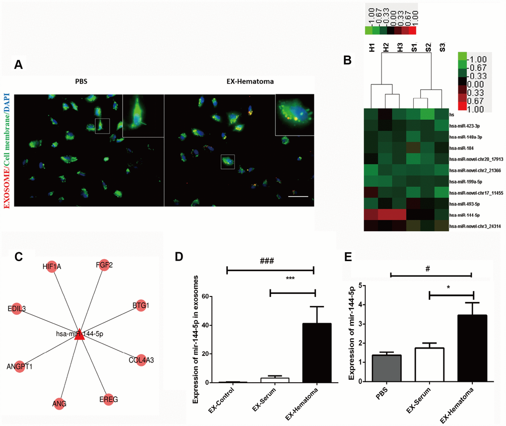 We investigated whether HUVECs could internalize hematoma-derived exosomes. Purified hematoma-derived exosomes co-localized with HUVECs following co-culture, suggesting that exosomes could be taken up by HUVECs (Figure 6A). Given that miRNAs are abundant in exosomes [26], we hypothesized that exosome-derived miRNAs could regulate gene expression in HUVECs. We therefore performed miRNA sequencing to evaluate differences in miRNAs content between hematoma- and serum-derived exosomes. The sequencing data were shown in Supplementary Tables 3 and 4. The miRNA expression patterns were similar among all types of exosomes (Supplementary Figure 1). Alterations in seven miRNAs were observed in hematoma- compared to serum-derived exosomes. Five miRNAs were upregulated while two were downregulated (two-fold change, adjusted P < 0.05) (Figure 6B). Of these miRNAs, miR-144-5p exhibited the largest difference in expression. We confirmed that miR-144-5p expression was higher in hematoma- compared to serum-derived exosomes by RT-PCR (Figure 6D). Thus, uptake of exosomes by HUVECs results in an increase in miR-144-5p expression (Figure 6E).