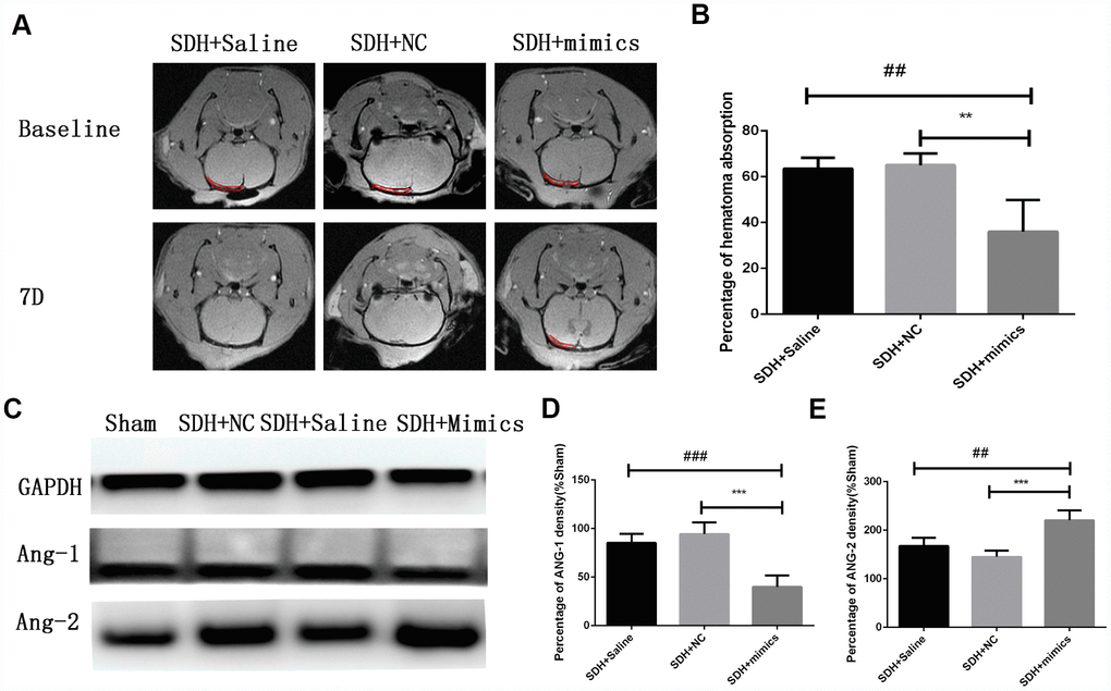 We overexpressed miR-144-5p in HUVECs Supplementary Figure 2 and analyzed the effects on angiogenesis in vitro. Transfection of HUVECs with miR-144-5p resulted in an increase in tube number, branch formation, and tube length (Figure 7A–7D). Additionally, miR-144-5p over-expression resulted in increased permeability of HUVEC monolayers to FITC-Dextran (Figure 7E). Western blot analysis revealed that miR-144-5p over-expression resulted in increased ANG-2 and decreased ANG-1 expression in HUVECs (Figure 7F–7H). Finally, we investigated the effects of miR-144-5p over-expression in SHD rats. Over-expression resulted in an increase in miR-144-5p on hematoma membranes (Supplementary Figure 3) and reduced hematoma absorption (Figure 8A, 8B). Increased ANG-2 and decreased ANG-1 were observed 7 days after induction were observed 7 days after induction, consistent with the results of the in vitro studies (Figure 8C–8E).